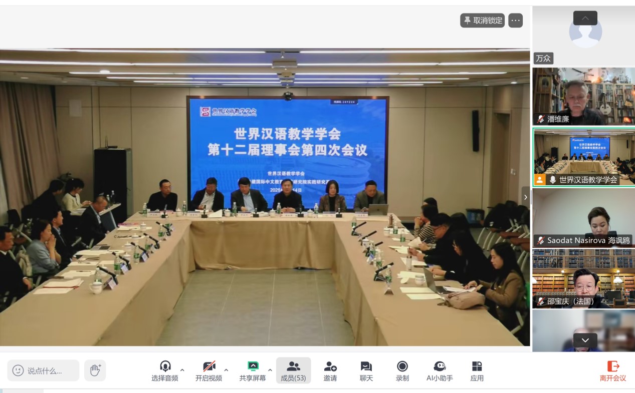 北京时间2025年3月14日,世界汉语教学学会第十二届理事会第四次会议在天津师范大学召开,来自中国、美国、英国、日本、肯尼亚、澳大利亚等22个国家和地区的54位理事以线上和线下相结合的方式参会。本次会议由钟英华会长主持,宋永波秘书长作了学会2024年工作总结、2025年工作要点、经费支出和预算情况汇报,语言理论与语言教育研究分会等8家分支机构分别汇报了年度工作总结和计划。杨金成副秘书长、杨薇副秘书长,语合中心学术组织联络处尹冬民处长列席会议。